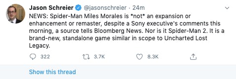 Later, Bloomberg's Jason Schreier clarified that Miles Morales will be comparable in size and scope to the fun-sized Uncharted 4 spinoff, The Lost Legacy.