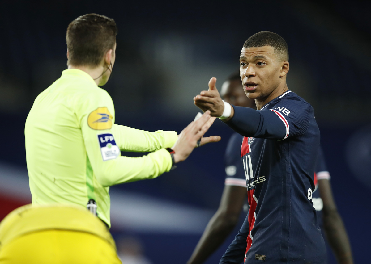 Soccer Football - Ligue 1 - Paris St Germain v Nimes Olympique - Parc de Princes, Paris, France - February 3, 2021 Paris St Germain's Kylian Mbappe and referee Francois Letexier react REUTERS/Gonzalo Fuentes