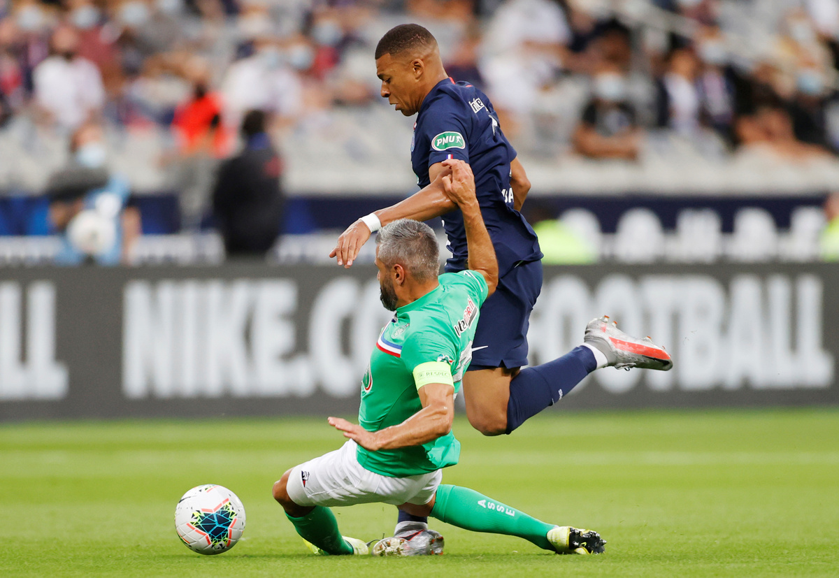 A rough tackle from Loic Perrin saw the St Etienne defender catch Mbappe on the ankle and the 21-year-old collapsed on the pitch in pain before he was substituted. Perrin was sent off for the challenge as PSG won 1-0.
