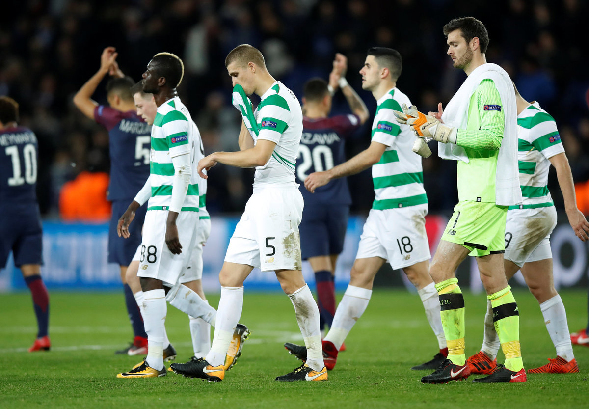Soccer Football - Champions League - Paris St Germain vs Celtic - Parc des Princes, Paris, France - November 22, 2017 Celtic's players look dejected at the end of the match REUTERS/Christian Hartmann