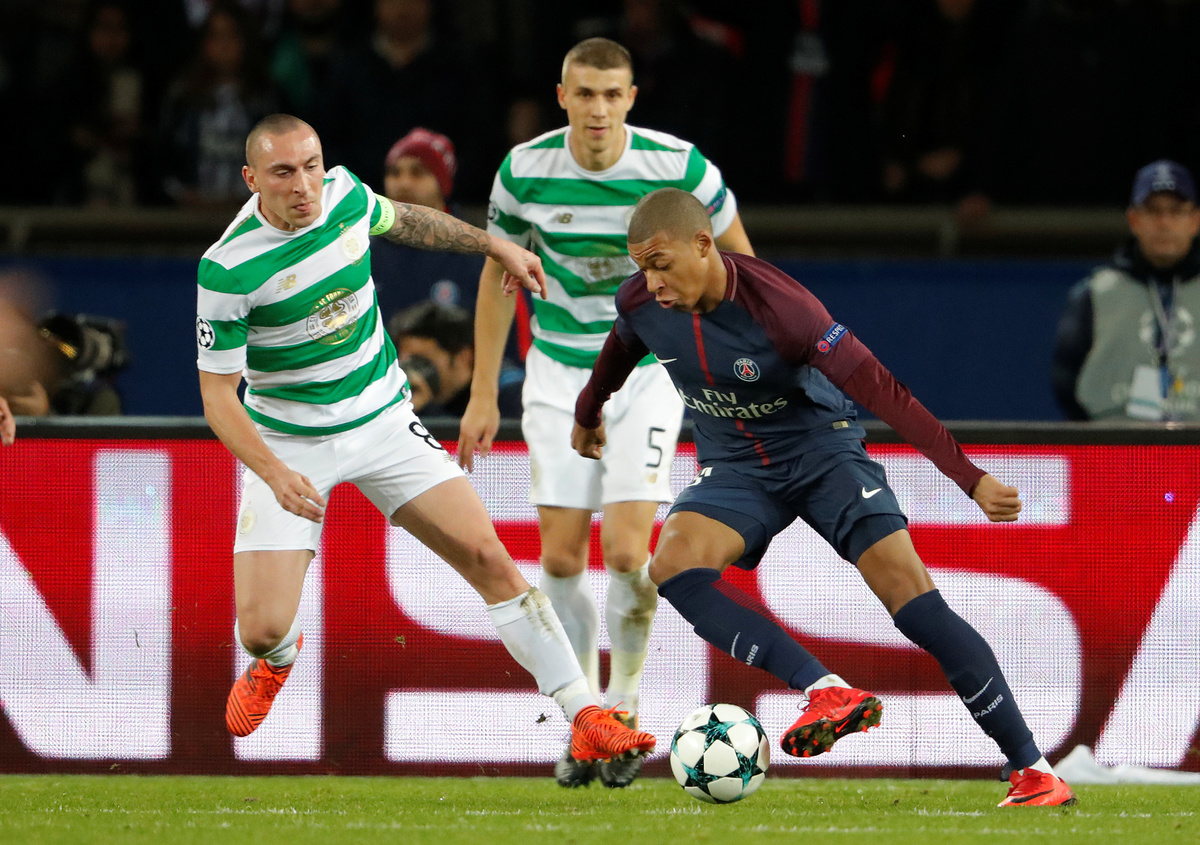 Soccer Football - Champions League - Paris St Germain vs Celtic - Parc des Princes, Paris, France - November 22, 2017 Paris Saint-Germain’s Kylian Mbappe in action with Celtic’s Scott Brown and Jozo Simunovic REUTERS/Charles Platiau