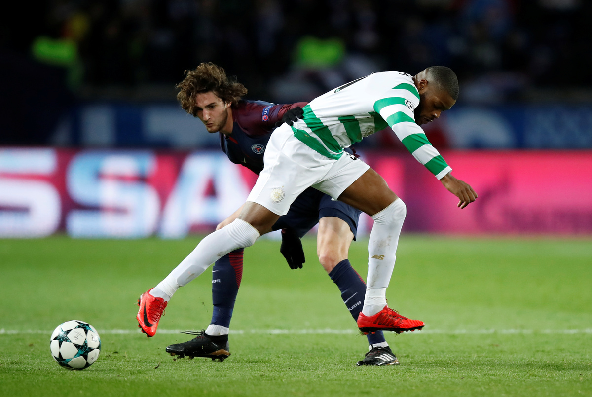 Soccer Football - Champions League - Paris St Germain vs Celtic - Parc des Princes, Paris, France - November 22, 2017 Paris Saint-Germain’s Adrien Rabiot in action with Celtic’s Scott Brown and Kieran Tierney REUTERS/Christian Hartmann