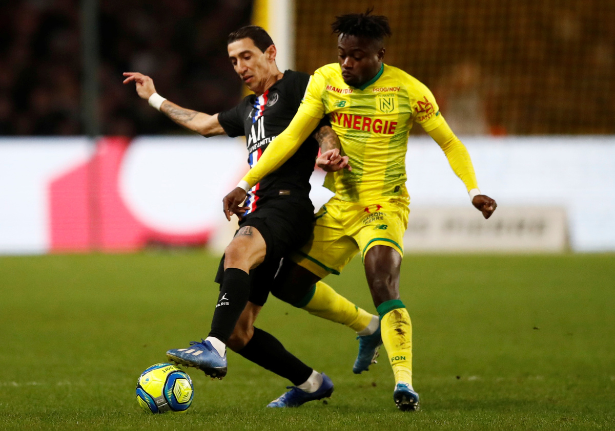 Soccer Football - Ligue 1 - Nantes v Paris St Germain - The Stade de la Beaujoire - Louis Fonteneau, Nantes, France - February 4, 2020 Paris St Germain's Angel Di Maria in action with Nantes' Moses Simon REUTERS/Stephane Mahe