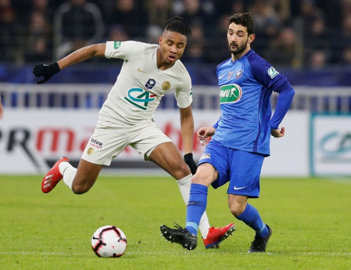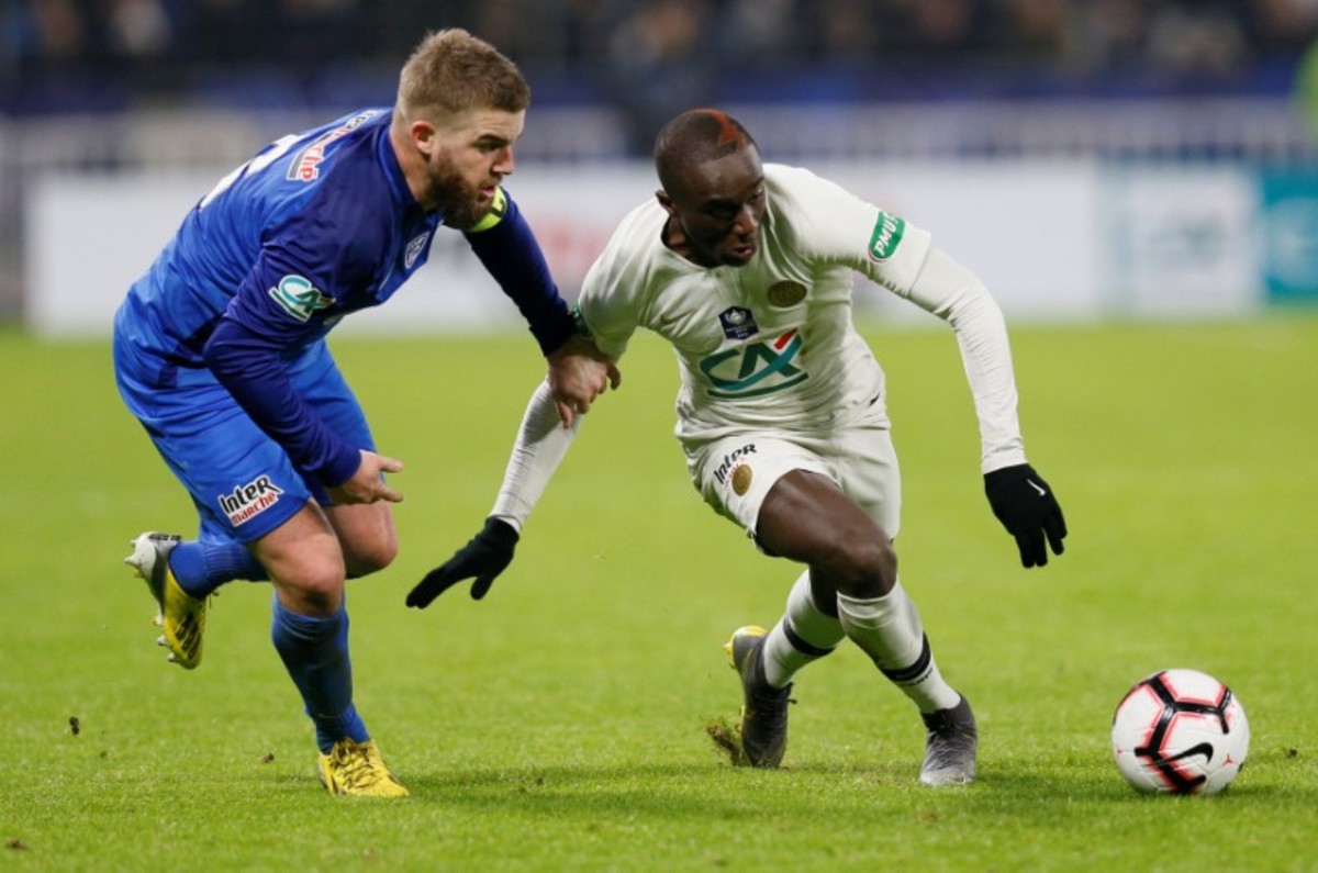 Soccer Football - Coupe de France - Round of 16 - FC Villefranche v Paris St Germain - Groupama Stadium, Lyon, France - February 6, 2019 Paris St Germain's Moussa Diaby in action with FC Villefranche's Maxime Jasse REUTERS/Emmanuel Foudrot
