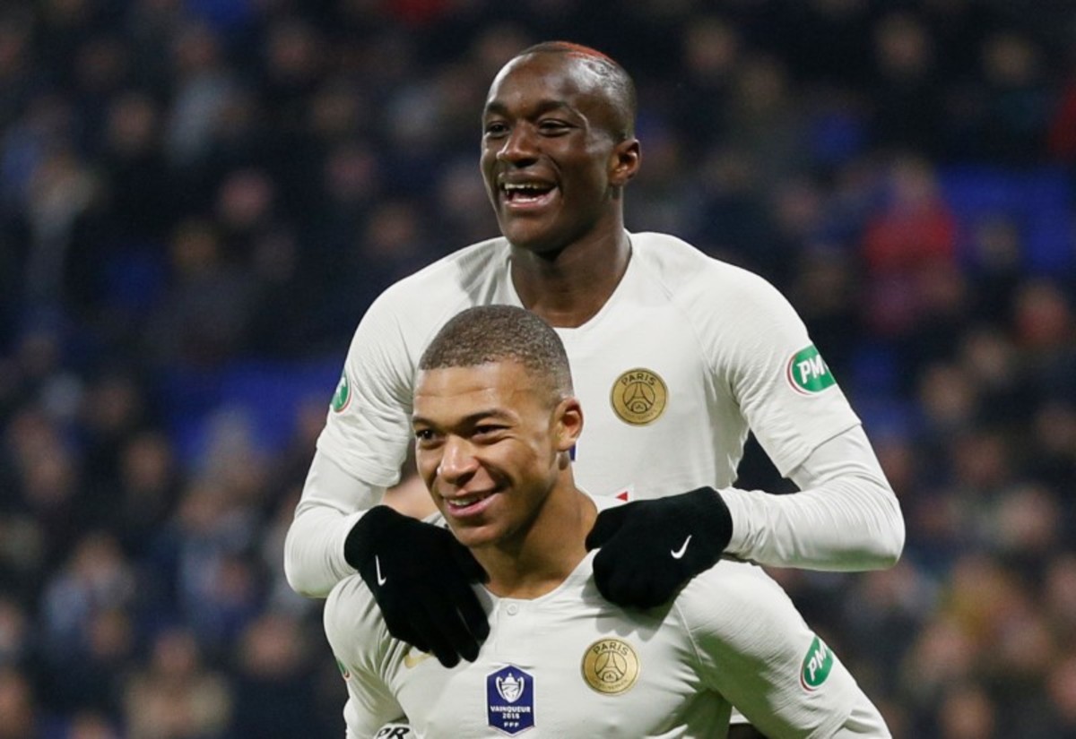 Soccer Football - Coupe de France - Round of 16 - FC Villefranche v Paris St Germain - Groupama Stadium, Lyon, France - February 6, 2019 Paris St Germain's Moussa Diaby celebrates scoring their second goal with Kylian Mbappe REUTERS/Emmanuel Foudrot