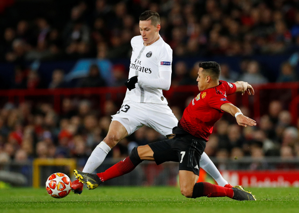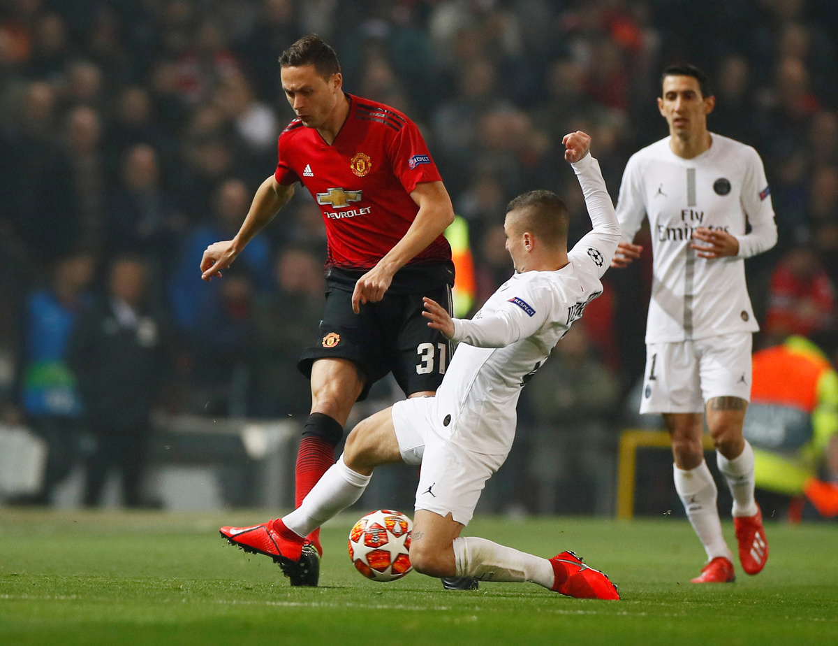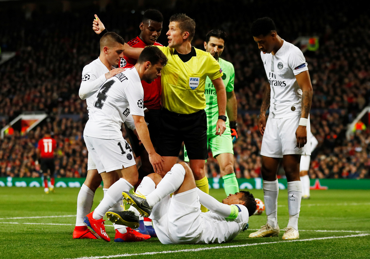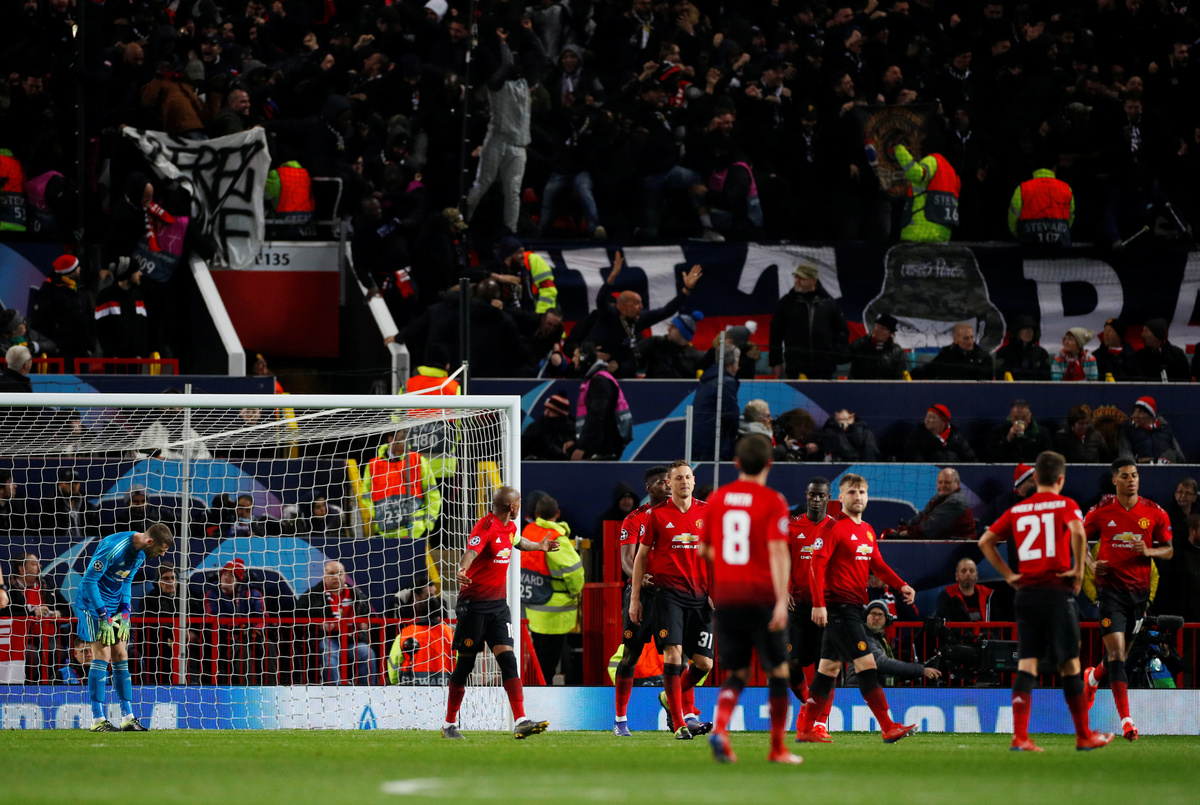 MANCHESTER, England (Reuters) - Manchester United's Champions League hopes were hanging by a thread after a 2-0 home defeat by Paris St Germain in their round-of-16, first leg match on Tuesday, with talisman Paul Pogba sent off late in the game.