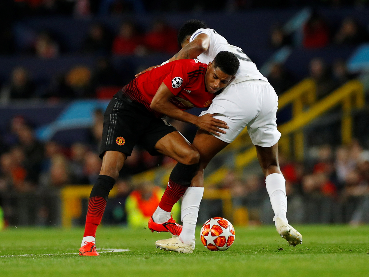 Soccer Football - Champions League Round of 16 First Leg - Manchester United v Paris St Germain - Old Trafford, Manchester, Britain - February 12, 2019 Manchester United's Marcus Rashford in action with Paris St Germain's Presnel Kimpembe REUTERS/Phil Noble