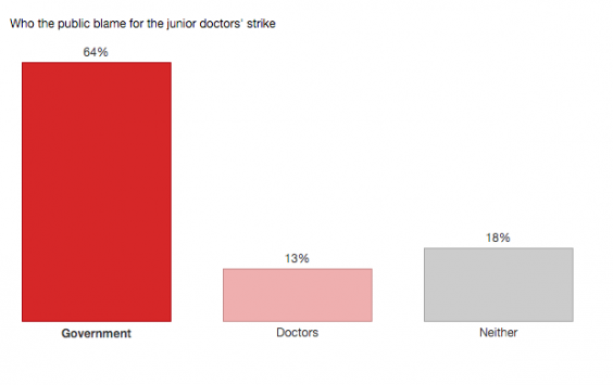 The Ipsos MORI survey conducted for the Health Service Journal shows 64 per cent blame the Government for the strike while just 13 say it is junior doctors' fault.