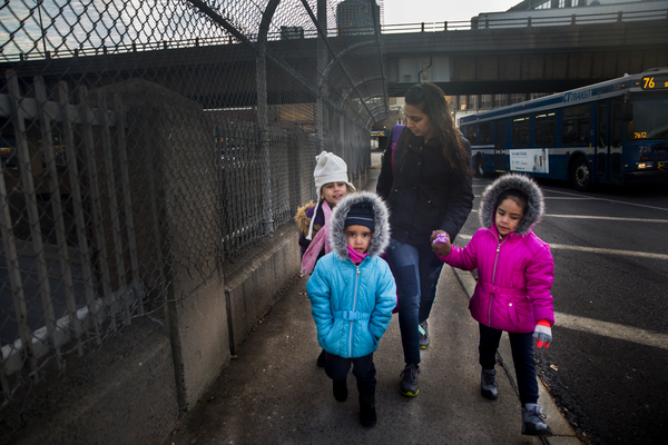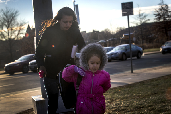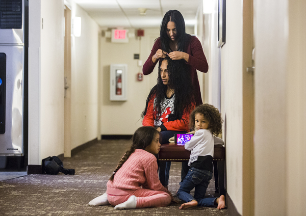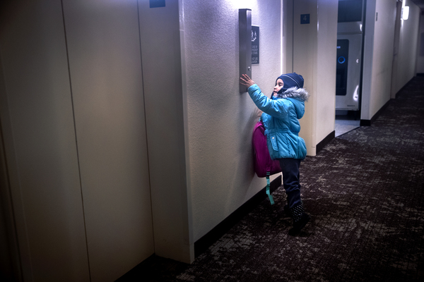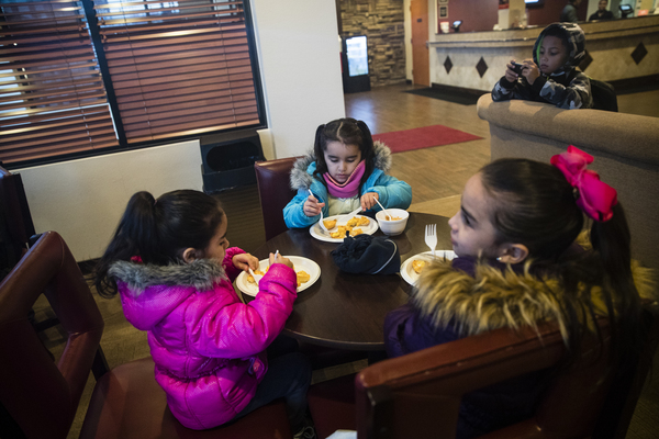 In the predawn darkness, Morales, 28, gets her girls ready for school, walking them, bleary eyed, to breakfast in the lobby. At night, they cook makeshift meals of rice and beans on a hot plate, storing what leftovers can fit into the mini fridge in their room.