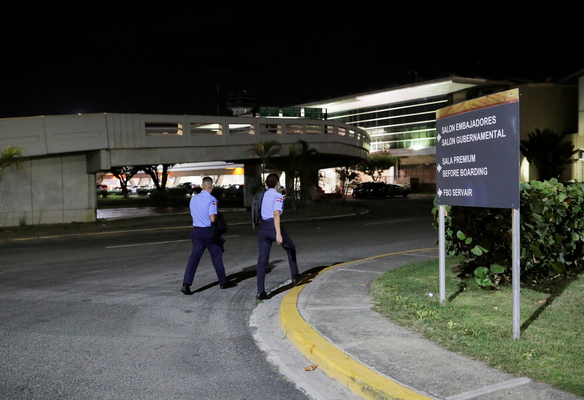 FILE PHOTO: Police members of roadside assistance stand outside the Las Americas International Airport where a private jet crashed on Wednesday, killing all nine people on board, including Puerto Rican music producer Flow La Movie, according to the airline and local media in Santo Domingo, Dominican Republic December 16, 2021. REUTERS/Ricardo Rojas