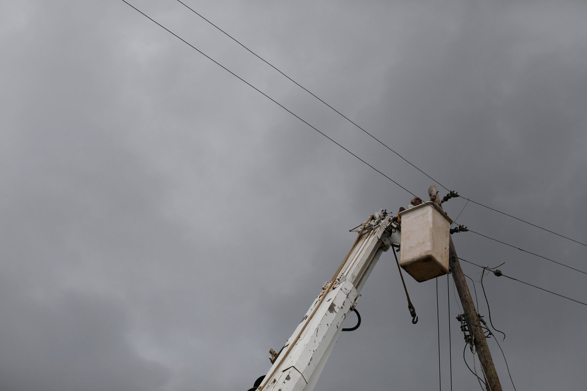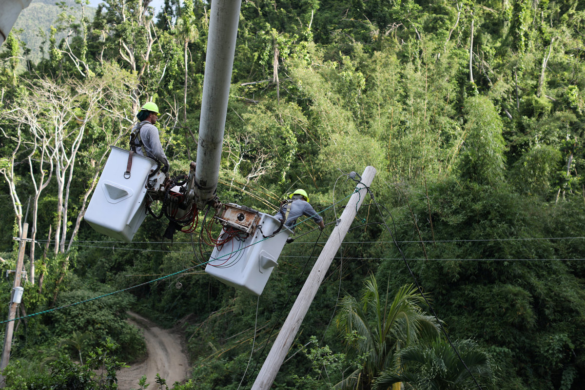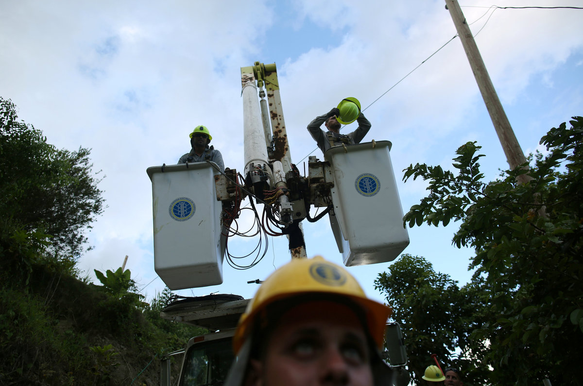 Workers of Puerto Rico's Electric Power Authority (PREPA) repair part of the electrical grid as the island's fragile power system is still reeling from the devastation wrought by Hurricane Maria eight months ago, in Utuado, Puerto Rico May 17, 2018. REUTERS/Alvin Baez