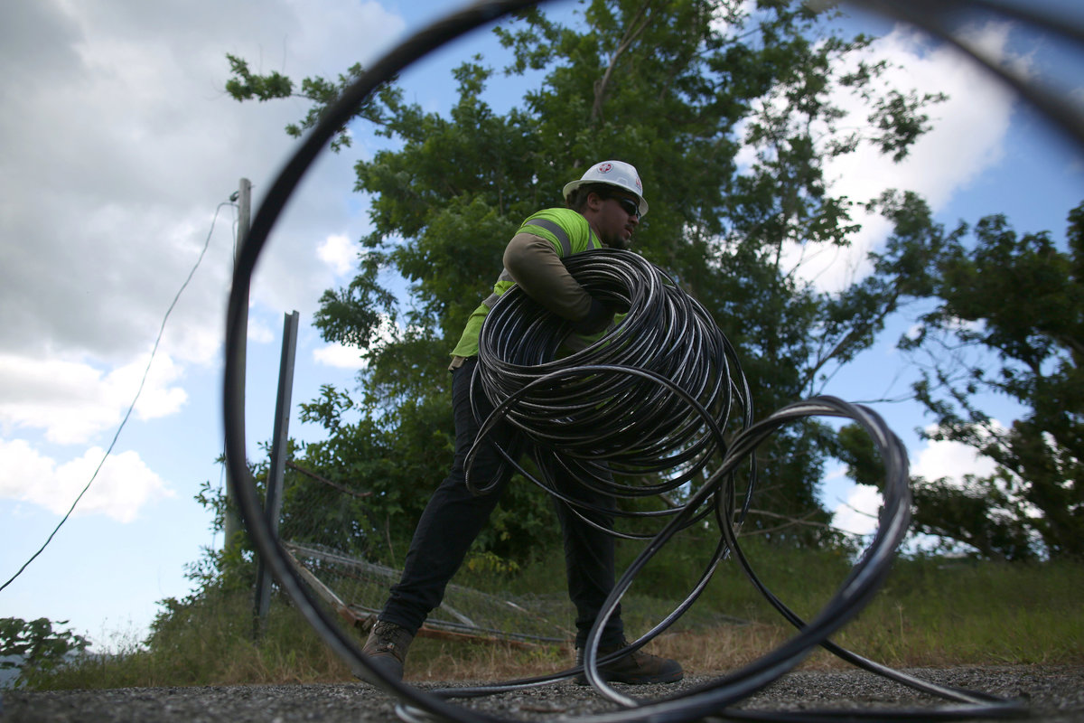 A contractor of the U.S. Army Corps of Engineers carries cables as the island's fragile power system is still reeling from the devastation wrought by Hurricane Maria eight months ago, in Utuado, Puerto Rico May 17, 2018. REUTERS/Alvin Baez
