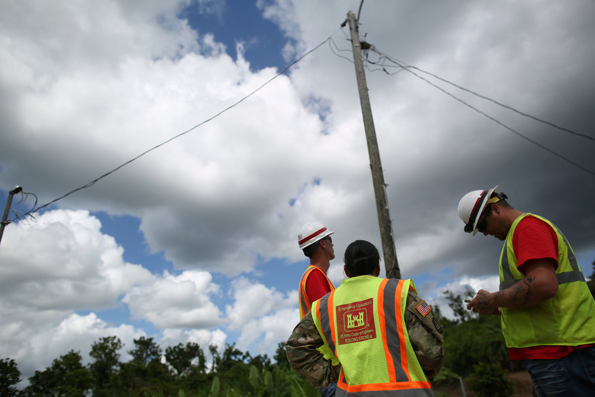 Members of the U.S. Army Corps of Engineers stand underneath an electricity pole, as the island's fragile power system is still reeling from the devastation wrought by Hurricane Maria eight months ago, in Utuado, Puerto Rico May 17, 2018. REUTERS/Alvin Baez