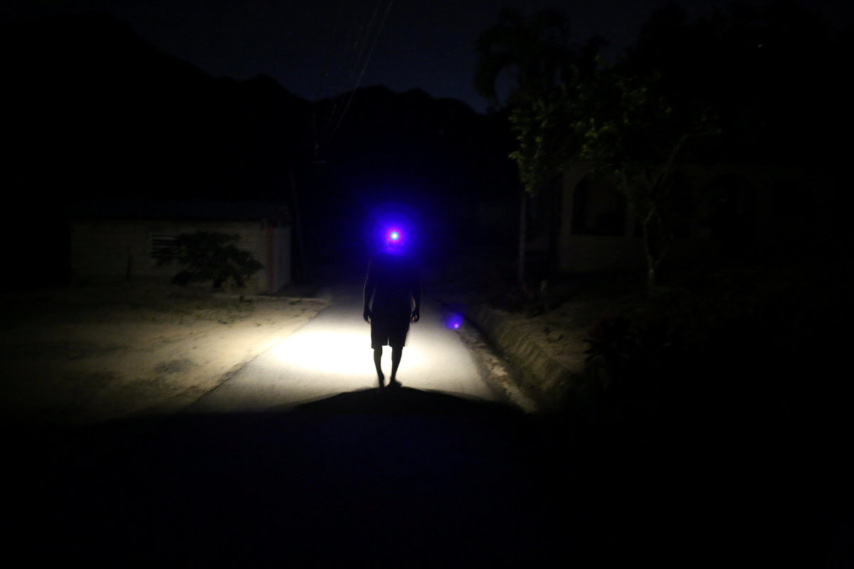 Jose Alvarez, 60, uses a head lamp while walking in the dark as the island's fragile power system is still reeling from the devastation wrought by Hurricane Maria eight months ago, in Jayuya, Puerto Rico May 10, 2018. REUTERS/Alvin Baez