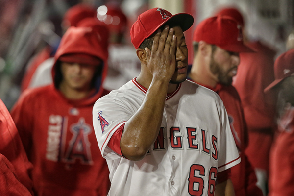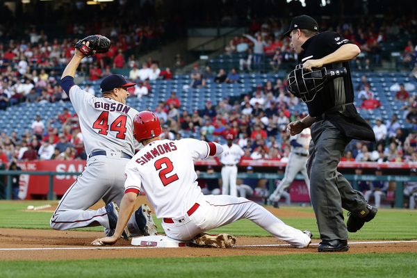 Andrelton Simmons led off with a single up the middle. Kole Calhoun next popped a ball up down the third-base line. He thought it was bound for foul territory, but it was not. It landed fair for a single, but Simmons tried for third and was thrown out. Pujols next struck out and Yunel Escobar grounded out.