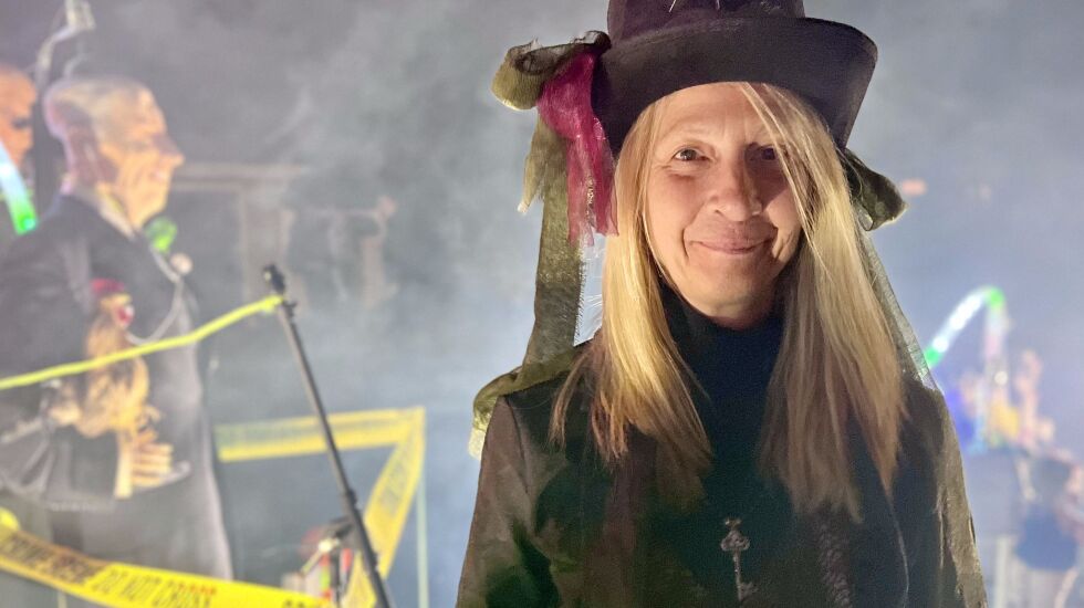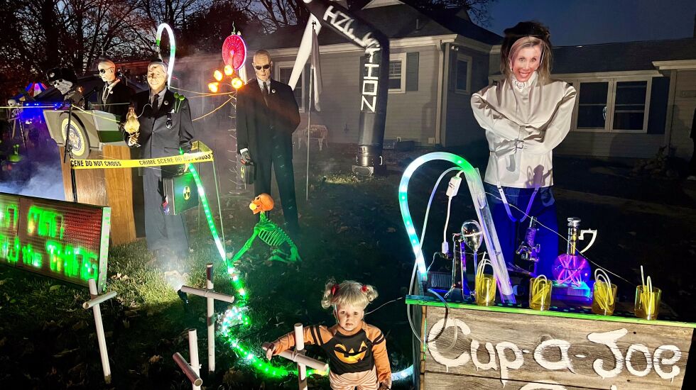 Among the ghouls, clowns and other frights haunting her front yard — a yearly attraction in this northwestern Illinois city of 24,000 — Tricker’s newest installation features a dummy of President Joe Biden with a tube connecting his head to an ominous laboratory staffed by a straitjacketed Nancy Pelosi.