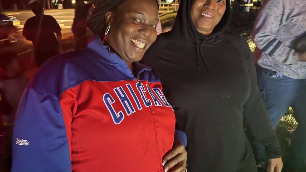 LaRhonda Jones and Tanisha McKenzie are on the opposite end of the political spectrum from Tricker, but they had a hoot over her Halloween spectacle as they made their way through the neighborhood with their families.