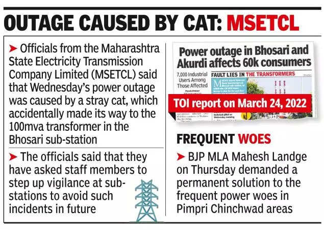 Jayant Weekey, chief engineer, MSETCL, Pune, told TOI, “We are working on replacement of two transformers at the earliest. The affected one will be replaced by Saturday and the defunct one eplaced by next week. The transformer was affected due to a cat, which got onto it. And we have asked our employees to keep strict vigilance to avoid such incidents in future.”