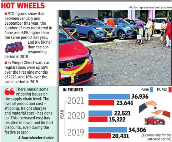 As per regional transport office (RTO) data, between January and September this year, the number of cars registered in Pune was 64% higher than the same period last year, and 8% higher than the corresponding period in 2019. In Pimpri Chinchwad, car registrations were up 55% over the first nine months of 2020, and 16% over the same period in 2019.