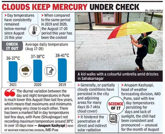 Anupam Kashyapi, head of weather forecasting division, India Meteorological Department (IMD) Pune, told TOI, “The diurnal variation between the day and night temperatures in Pune is much lower this August than last few years, which means that maximums and minimums are running very close to each other. There has been a marked fall in day temperatures last few days, with Pune (Shivajinagar) not recording maximum temperature around 30°C in over 10 days now.”
