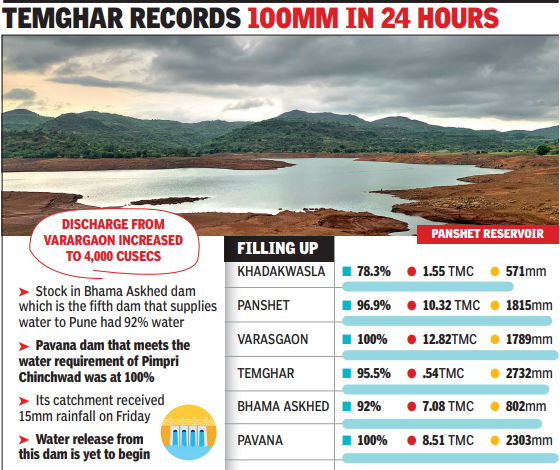 PUNE: The catchments of all the major dams that supply water to Pune and Pimpri Chinchwad have received good spells of rain in the last two days. Temghar reported 100mm rainfall in 24 hours ending on Friday morning, which was the highest among the five dams that supply water to Pune.