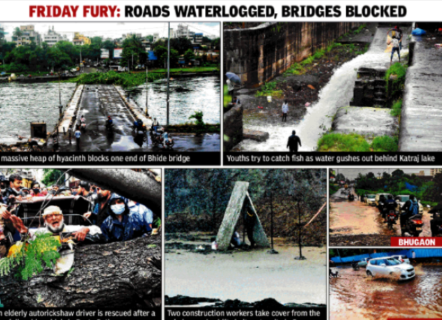 The city roads resembled rivers at several spots in Warje, Karvenagar and Mhatre bridge. Waterlogging on roads near Bhairoba nullah triggered congestion in Fatimanagar. Traffic slowed in other parts too. Discharge from Khadakwasla swelled the Mutha river and submerged the Bhide bridge. The situation was better at Ambil Odha compared to the September 25, 2019 deluge as PMC continued water discharge from the two Katraj lakes . At least “15-foot free level” would constantly be maintained at the lakes, an official said.