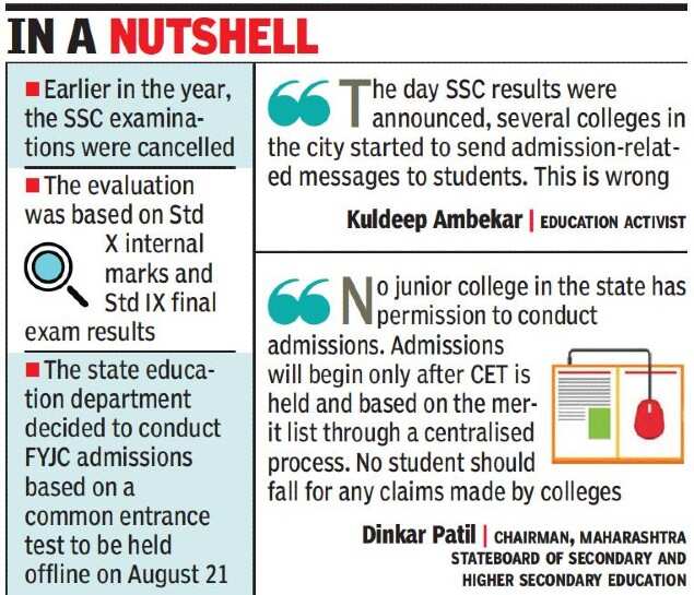 PUNE: Even before the common entrance test (CET) for first-year junior college (FYJC) is conducted, many colleges in the city have reportedly started admitting students to Class XI.