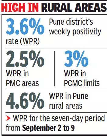 The district’s WPR for the seven-day period from September 2 to 9 was 3.6%. While it was 2.5% in the Pune Municipal Corporation (PMC) areas, it was 3% in the Pimpri Chinchwad Municipal Corporation (PCMC) limits and 4.6% in the Pune rural areas.