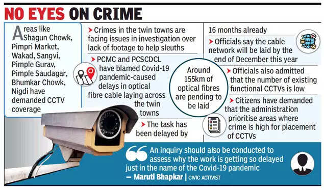 PCMC executive engineer Thomas Noronha told TOI, “The work of installation of CCTVs is lagging due to the fact that first, the optical fibre cable network needs to be laid down at the earliest. The underground cable networking will cover around 700km in the twin towns, of which currently around 545km is completed, while the remaining kilometres are likely to be covered by the end of next month.”