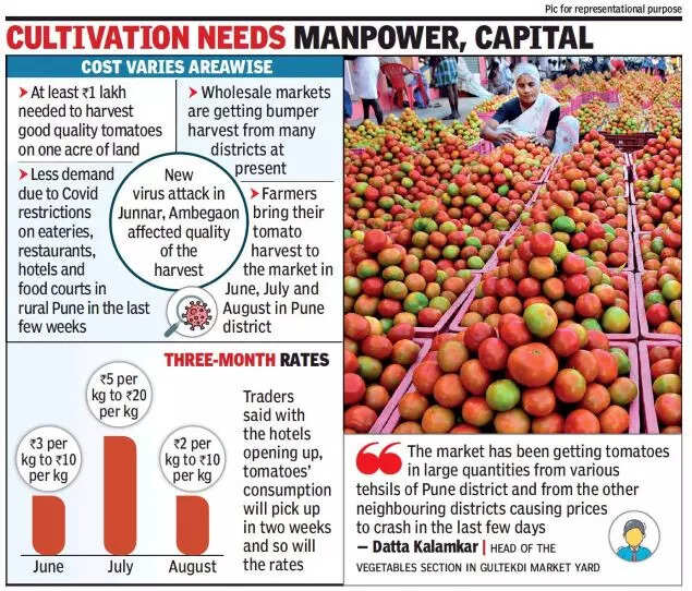 PUNE: Tomatoes are selling dirt cheap, cheaper than one kg of salt or a packet of chips, in the Gultekdi Market Yard and in other wholesale markets across the district because of a glut in supply, forcing growers to throw away the kitchen staple in several places.
