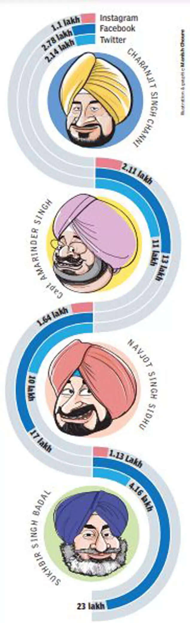 On the micro-blogging website, Sidhu has 1 million, or 10 lakh, followers, Sukhbir has 4. 16 lakh followers, and Amarinder has 11 lakh followers. The rise in the number of followers on Facebook has not been as sharp for Channi as on Instagram and Twitter. On Facebook, the number of people who like his page have risen from 74,000 on September 20 to 2,78,741 now. The number of followers are 4. 54 lakh.