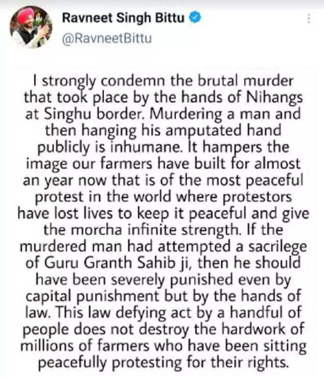 In the statement posted on his Twitter account, Bittu said, "I strongly condemn the brutal murder the hands of Nihangs at Singhu Border. Murdering a man and then hanging his amputated hand publicly is inhuman. It hampers the image our farmers have built for almost an year now, that is of the most peaceful protest in the world where protestors have lost lives to keep it peaceful and give the morcha infinite strength. If the murdered man had attempted a sacrilege of Guru Granth Sahib ji, then he should have been severely punished even by capital punishment but by hands of law. This law defying act by a handful of people can destroy the hard work of millions of farmers who have been sitting peacefully protesting for their rights".