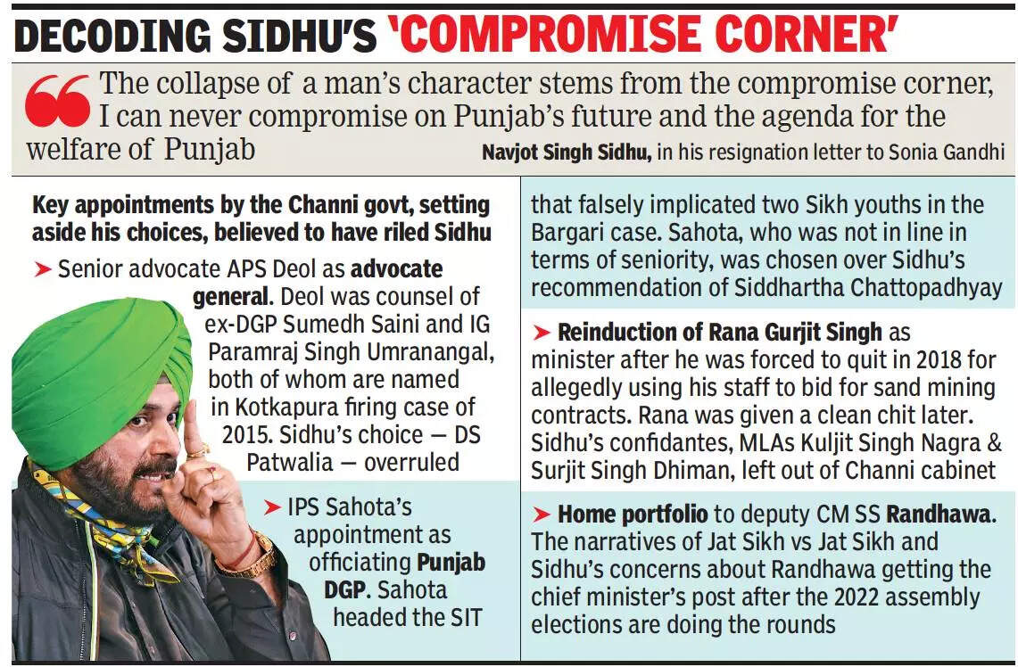 The party’s central leadership too was keen to put Sidhu in check, according to sources. There was resentment among leaders that Sidhu, immediately after the change of guard in Punjab, got the chairman of Amritsar Improvement Trust changed, especially as it was felt that he had targeted a genuine small Congress worker. The central leadership also wanted to be sure that Sidhu allowed chief minister Channi to work independently and not come across as the man running the show from behind the scenes. It was for these reasons that many of Channi’s preferences prevailed, which ultimately seem to have provoked Sidhu.