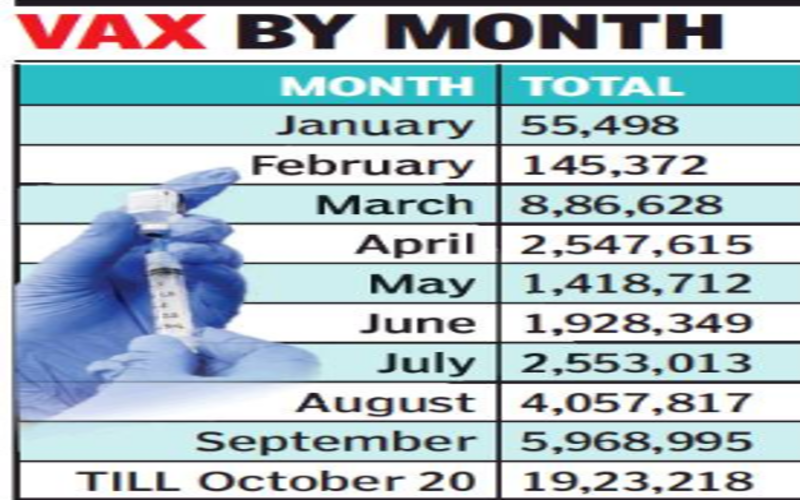 After struggling with low coverage for nearly the first seven months, largely due to irregular supply, vaccine coverage got a boost in September with an average of 1.98 lakh shots administered daily across the state, the highest since the start of the drive in January. The pace of drive has again taken a hit in October, with only 19,23,218 people being immunised till October 20, accounting for 96,160 jabs per day on average. Explaining the reasons for the drop in vaccination pace in recent days, a senior health official said that demand has started to fall as the majority of the beneficiaries who were willing to get vaccinated have already received their first dose. The official said that the speed will further decline as the population yet to receive the first dose comprise individuals who have vaccine hesitancy and have to be motivated to get immunised.