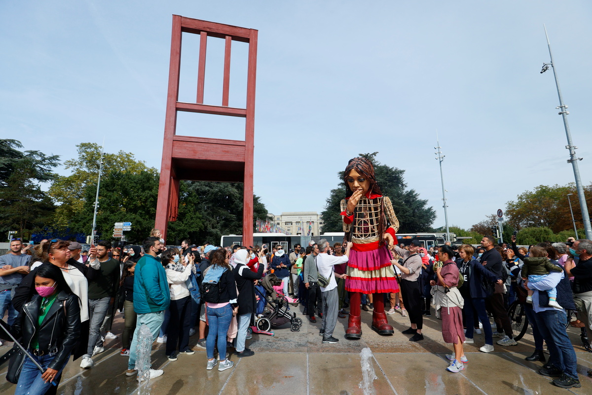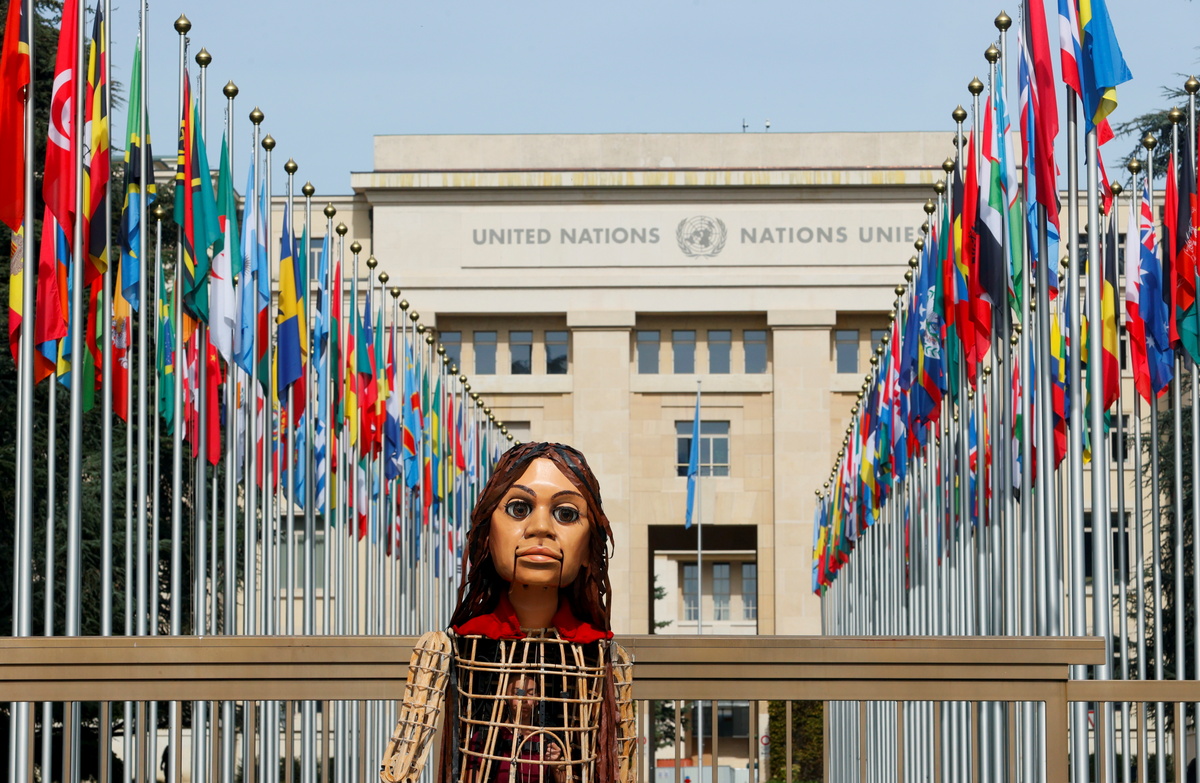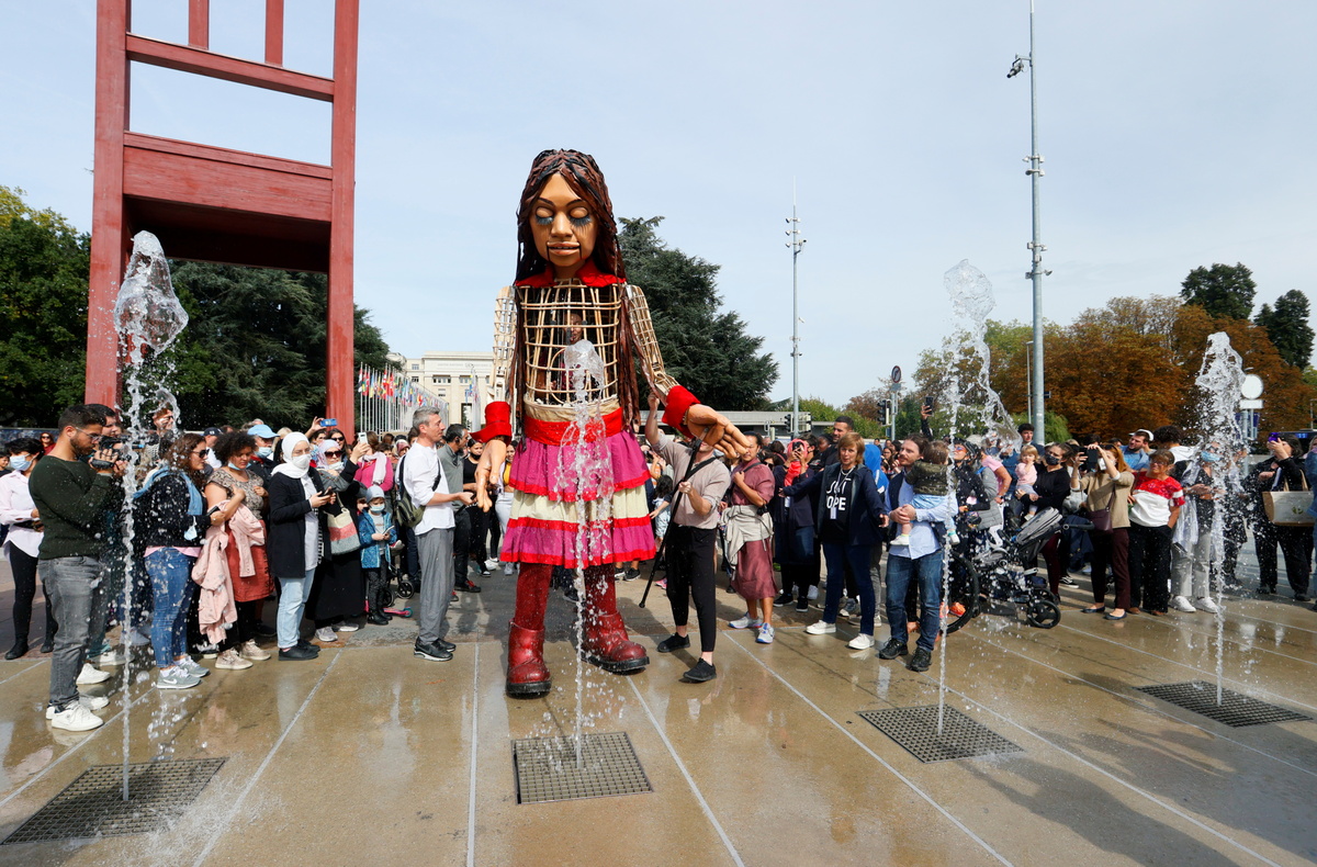 A 3.5-metre (11.5 ft)-tall puppet depicting a Syrian refugee girl arrived in Geneva on Tuesday as part of an 8,000-km (4,970-mile) walk across Europe to raise awareness of the plight of young refugees.