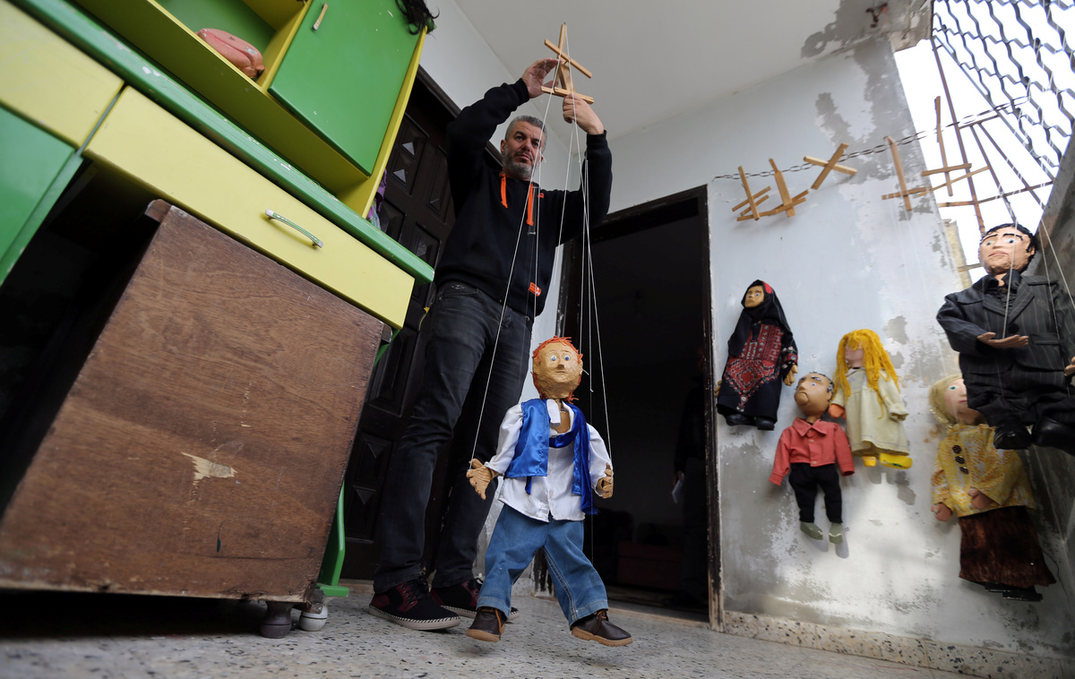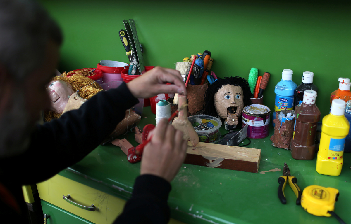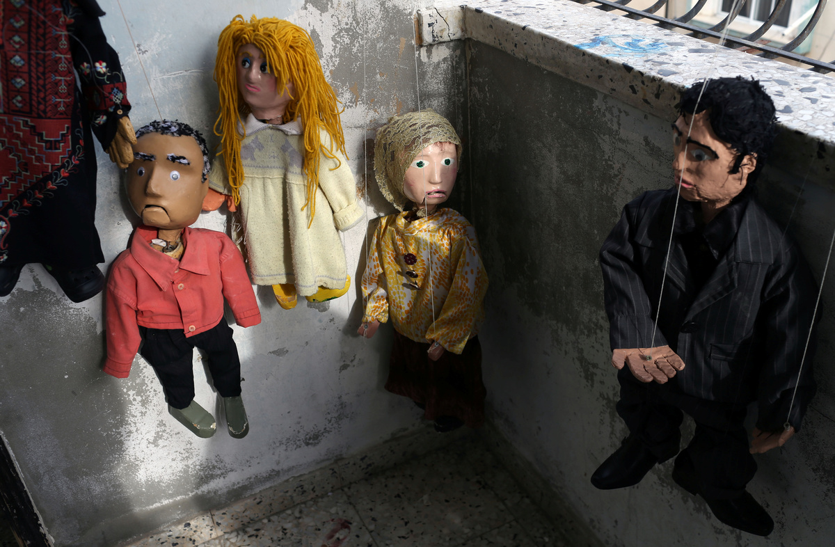 A girl plays with a marionette puppet made by Palestinian artist Mahdi Karera, during a show at a kindergarten in Gaza City January 29, 2019. REUTERS/Ibraheem Abu MustafaPalestinian artist Mahdi Karera holds a marionette puppet he made, at his house balcony in Gaza City January 20, 2019. REUTERS/Ibraheem Abu MustafaMarionette puppets, made by Palestinian artist Mahdi Karera, are seen at his house balcony in Gaza City January 20, 2019. REUTERS/Ibraheem Abu MustafaPalestinian artist Mahdi Karera makes a marionette puppet at his house balcony in Gaza City January 20, 2019. REUTERS/Ibraheem Abu MustafaChildren look at marionette puppets made by Palestinian artist Mahdi Karera, during a show at a kindergarten in Gaza City January 29, 2019. REUTERS/Ibraheem Abu MustafaMarionette puppets, made by Palestinian artist Mahdi Karera, are seen during a show at a kindergarten in Gaza City January 29, 2019. REUTERS/Ibraheem Abu Mustafa
