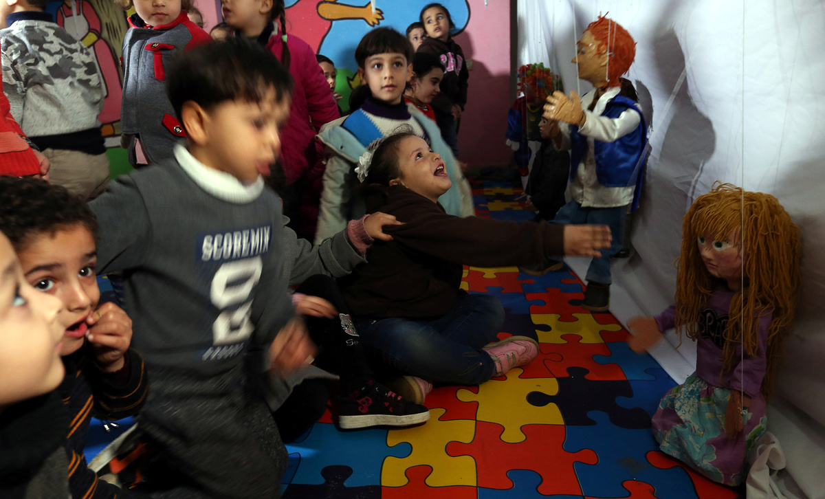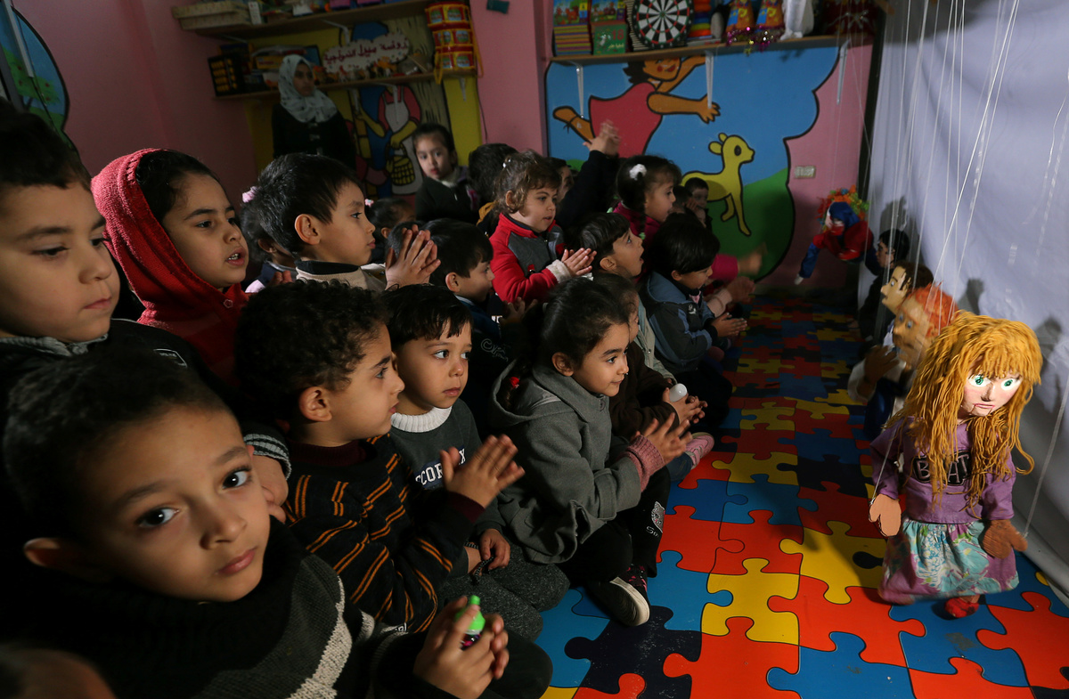 Children play with marionette puppets made by Palestinian artist Mahdi Karera, during a show at a kindergarten in Gaza City January 29, 2019. REUTERS/Ibraheem Abu Mustafa