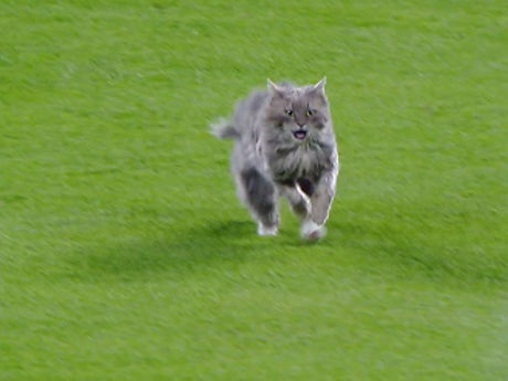The cat can be seen pausing amid its run, taking a second to sit down and gauge its surroundings, before eventually being wrangled by stadium personnel.