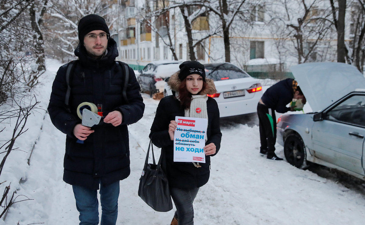 MOSCOW (Reuters) - Two young anti-Putin activists trudged through a snow-logged Moscow housing estate on a recent Saturday, putting up fliers promoting a boycott of a presidential election next month.
