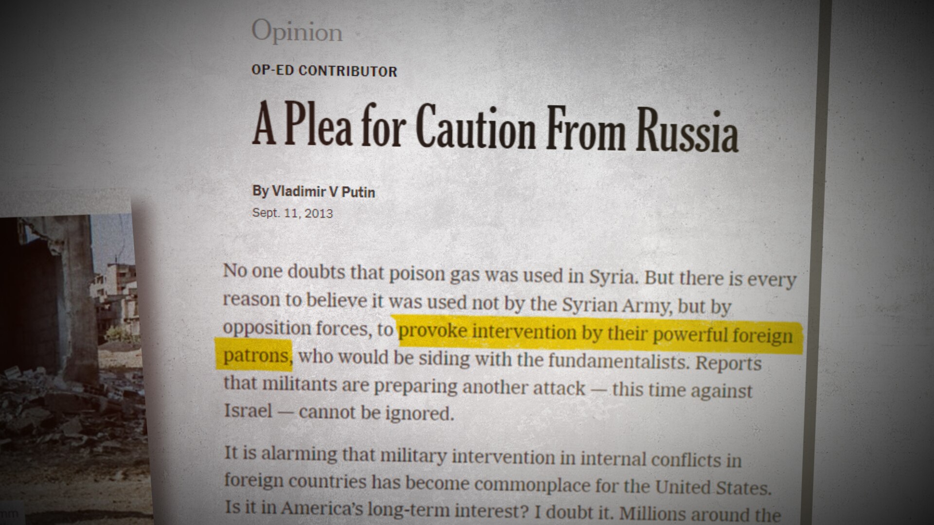 After a chemical attack killed at least 281 people in the south-western city of Ghouta in August 2013, President Putin penned an op-ed in the New York Times accusing opposition forces of gassing its own people to "provoke intervention by their powerful foreign patrons".