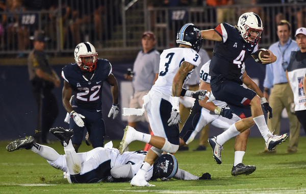 The deep threat was Reed, who was magnificent. At halftime, he had 105 receiving yards, more than he had all of last season in 11 games (104). After UConn took a 14-7 lead, it was Reed who answered, scoring on a 40-yard pass from Collins, over the top of the UConn defense.