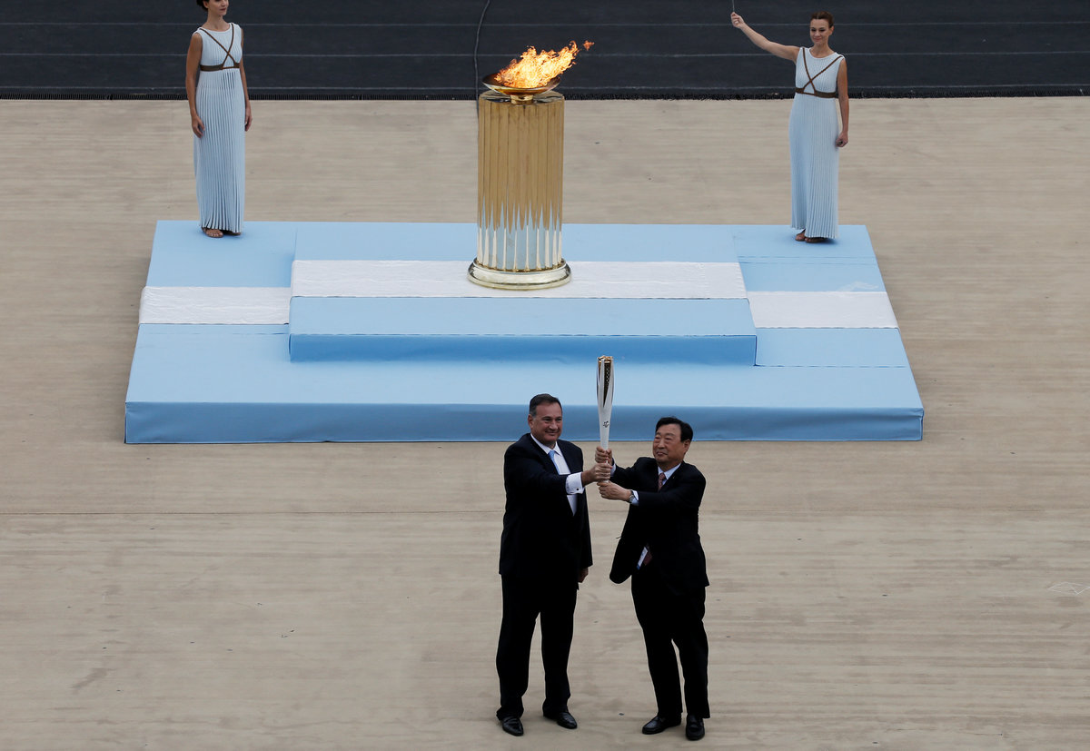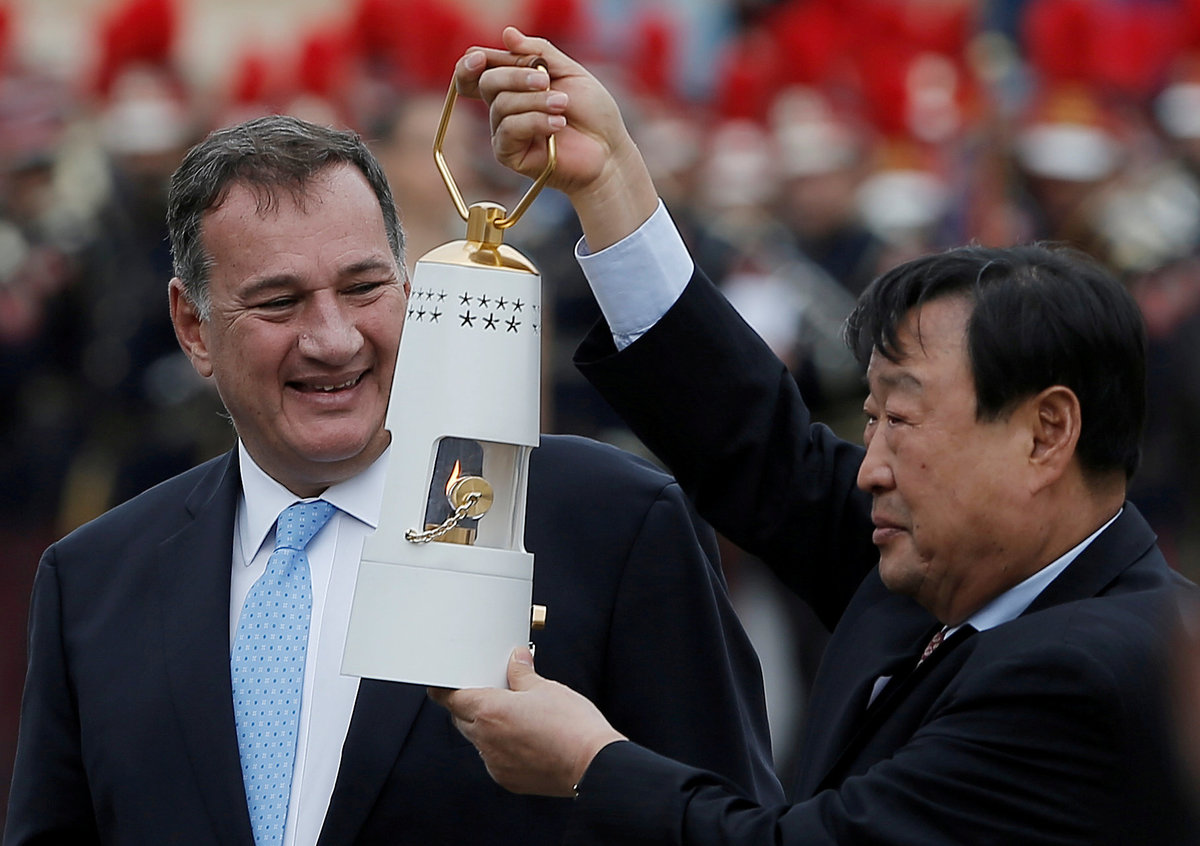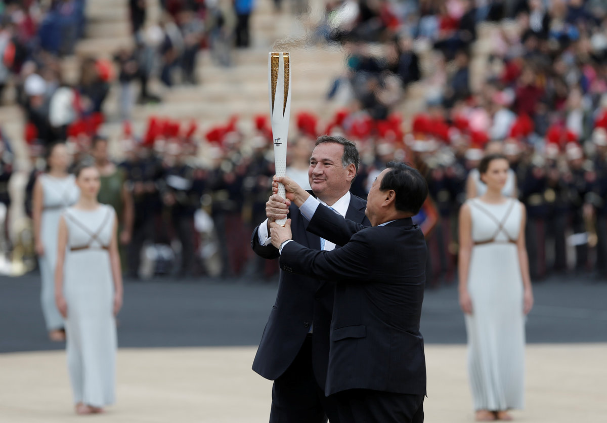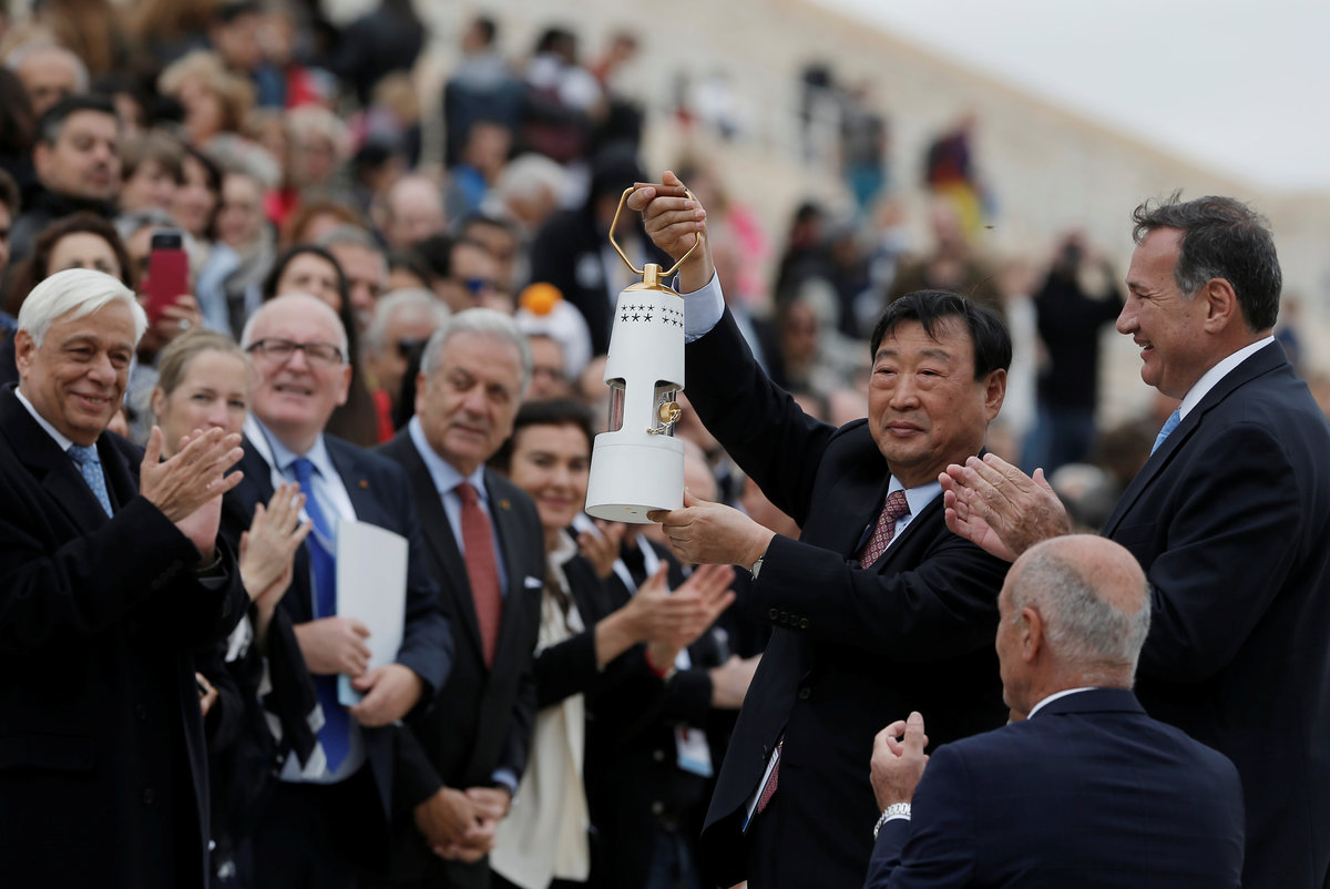 Athletics Olympic - Flame Handover Ceremony For Pyeongchang 2018 Olympics - Panathenaic Stadium, Athens, Greece - October 31, 2017 Lee Hee-beom, president and CEO of the Pyeongchang Organizing Committee for the 2018 Winter Olympic Games and President of the Hellenic Olympic Committee Spyros Capralos during the handover ceremony REUTERS/Costas BaltasAthletics Olympic - Flame Handover Ceremony For Pyeongchang 2018 Olympics - Panathenaic Stadium, Athens, Greece - October 31, 2017 Lee Hee-beom, president and CEO of the Pyeongchang Organizing Committee for the 2018 Winter Olympic Games and President of the Hellenic Olympic Committee Spyros Capralos during the handover ceremony REUTERS/Alkis Konstantinidis