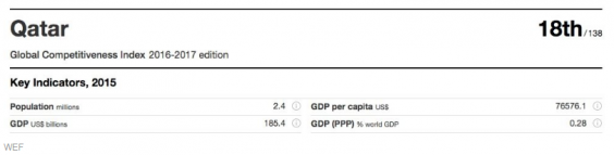 Qatar is one of the richest nations on the planet by GDP per capita. It is the 18th most competitive country in the world, according to the World Economic Forum's benchmark Global Competitiveness Report.