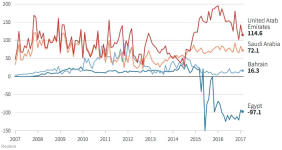 Here is the monthly data in US dollars showing the trade balance of Saudi Arabia, Egypt, Bahrain, and UAE, with Qatar: