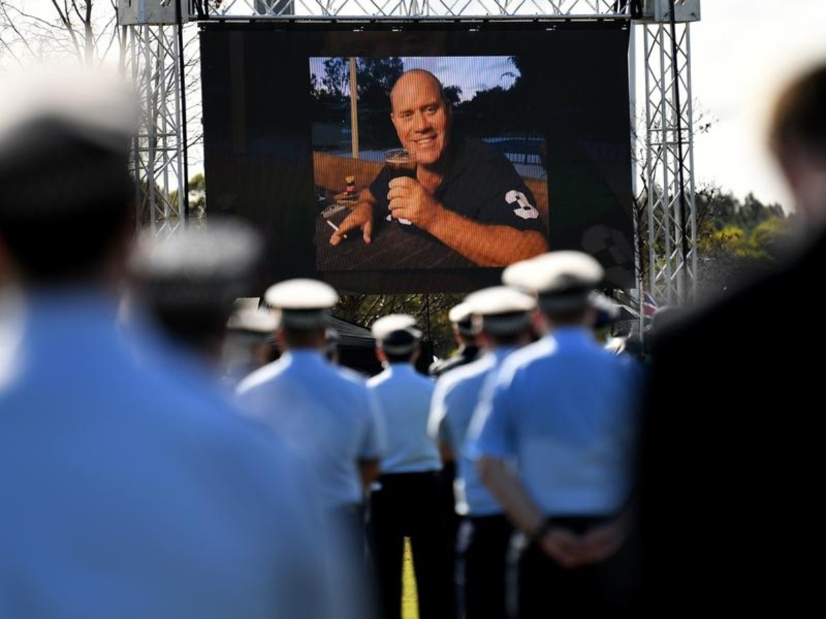 Just 100 mourners were allowed to attend the funeral service north of Brisbane, but row upon row of his colleagues stood outside, watching a live stream of his service.