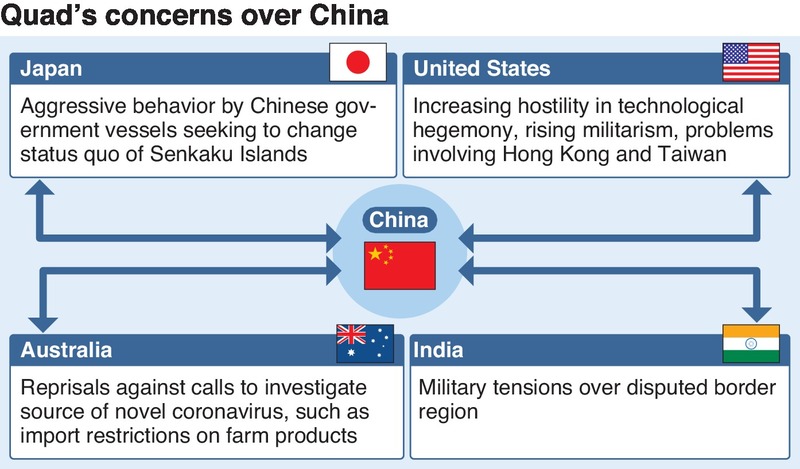 Many countries are concerned about China's increasingly hegemonic behavior in the Indo-Pacific, in areas such as the South and East China seas. Japan took the initiative in hosting this meeting among the foreign ministers of four countries, with an eye to curbing China.