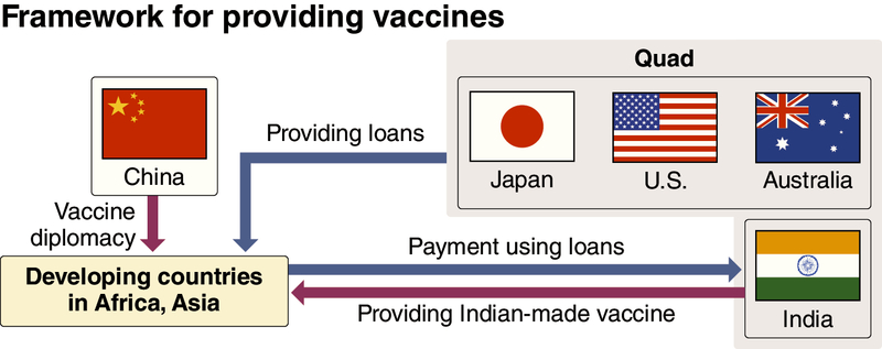 Under the new framework, three of the countries -- Japan, the United States and Australia -- will provide low-interest loans to developing countries in Asia and Africa, and each of those countries will use the funds to purchase vaccines made in India.