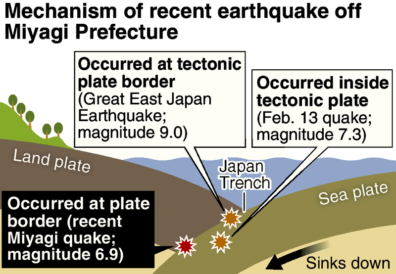 The March 20 earthquake that took place off Miyagi Prefecture occurred at the border of two tectonic plates, the same mechanism as the Great East Japan Earthquake, according to the Japan Meteorological Agency.