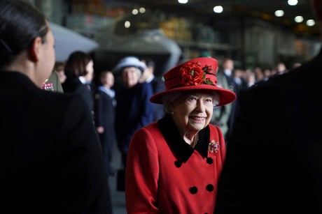Arriving by helicopter, the 95-year-old monarch was greeted by the ship’s commanding officer Captain Angus Essenhigh and Commodore Stephen Moorhouse, commander of the U.K. Carrier Strike Group.
