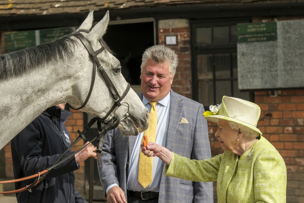 CASTLE CARY, England (Reuters) - Queen Elizabeth indulged her love of horse racing on Thursday with a visit to England's west country where she toured the stables of trainer Paul Nicholls.